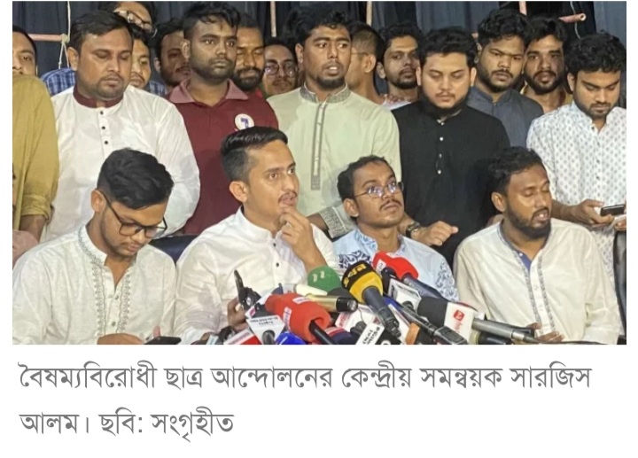বুধবার (৪ সেপ্টেম্বর) সংবাদ সম্মেলনে এ ঘোষণা দেন সমন্বয়ক সারজিস আলম। এসময় তার সঙ্গে হাসনাত আব্দুল্লাহসহ কয়েকজন সমন্বয়ক ও সহ-সমন্বয়ক উপস্থিত ছিলেন।
