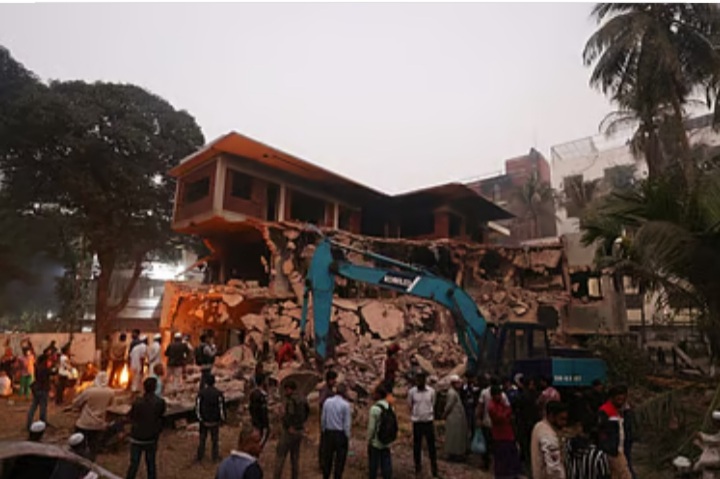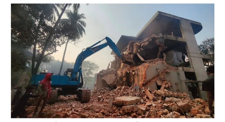 রাজধানীর ধানমন্ডি ৩২ নম্বরে শেখ মুজিবুর রহমানের বাড়িটির পেছনে (উত্তর দিকে) ছয়তলা ভবনটি ভাঙা হচ্ছে। ভবনটির ভেতর থেকে বই, স্টিল, লোহা, টিন, কাঠসহ বিভিন্ন জিনিস ভেঙে নিয়ে যাচ্ছেন অনেকে।